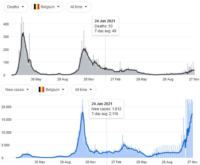 Belgische vaccinatiestrategie: zorgsector:jan/feb; 65-plussers & risicopatiënten:maart; sociaal en/of economisch essentiële beroepen:april; algemene bevolking:juni