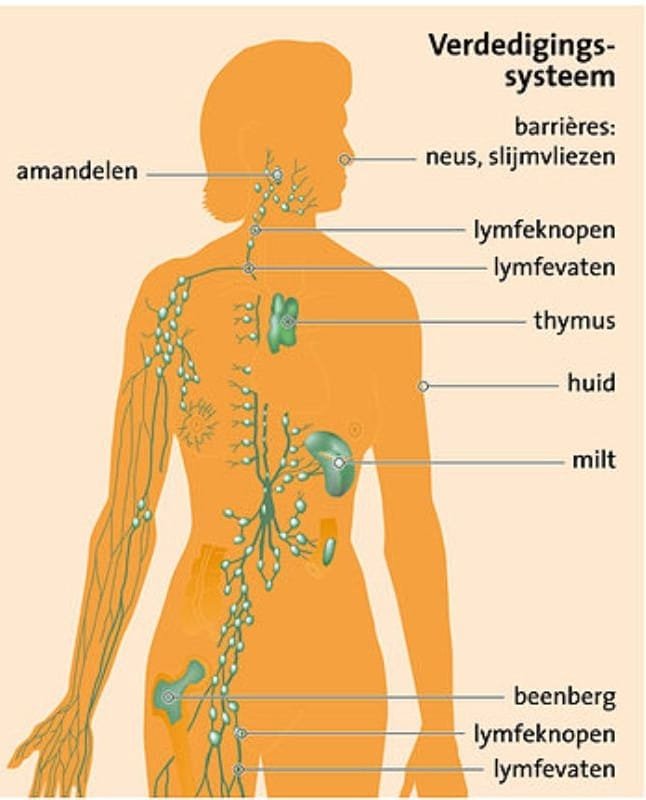 *Lymfoïde organen (thymus, beenmerg, milt, lymfeklieren verbonden door lymfevaten, neus- en keelamandelen, lever, appendix en Payer-plaques in de dunne darm).